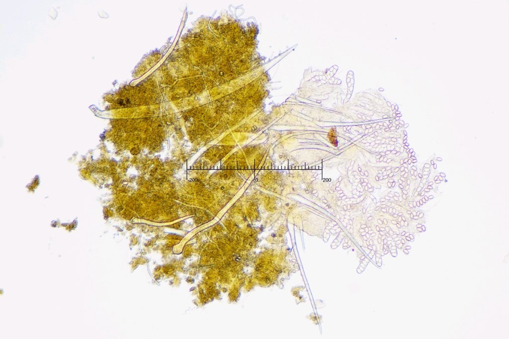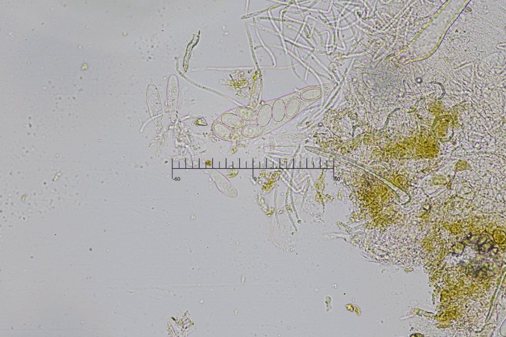 Die Sporen sind mit 17.4-18.6 x 10.9-11.9 um (Q = 1.5-1.6) an der unteren Grenze, aber noch innerhalb des von Bezerra und Kimbrough angegebenen Bereichs von (16-)18-24(-26) x (9-)12-14(-16) um. Kann daran liegen, dass ich die Sporen in den Schläuchen gemessen habe und diese noch nicht ganz reif waren.