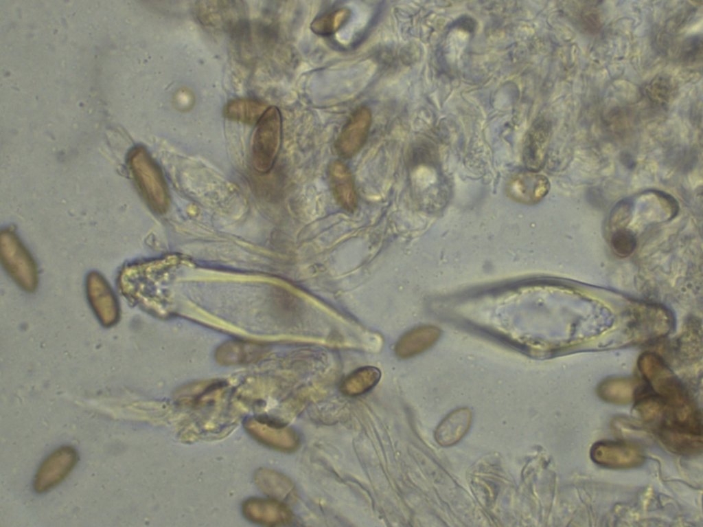 Dachte mir, die Kombination aus der besonderen Sporenform, der besonderen Zystidenform und -Inkrustination und dem speziellen Habitat, sollte doch zu einem Ergebnis führen...