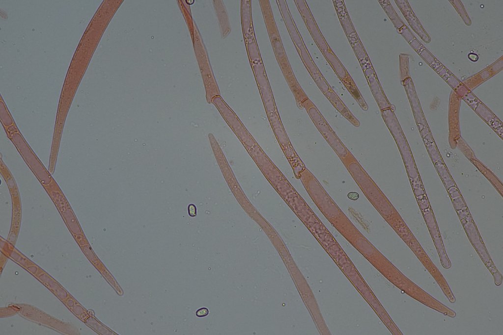 Kommen noch P. pouzarianus und P. primus in Frage. Bei P. primus haben laut Breitenbach/Kränzlin eigentlich alle Hyphen in der HDS an den Septen Schnallen - das beobachte ich bei unserem Exemplar. Bei P. pouzarianus sind es weniger - ca. 40%. Zudem sind bei P. primus - wie bei unserem - die Endhyphen in der HDS schmaler. Ich bin mir daher ziemlich sicher, dass es sich bei unserem Fund um P. primus handelt.