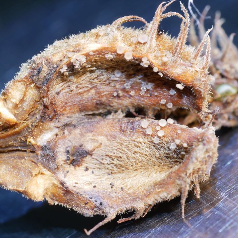 Als Merkmale sind u. a. die dickwandigen, mehrzelligen braunen Haare mit Kristallschopf
