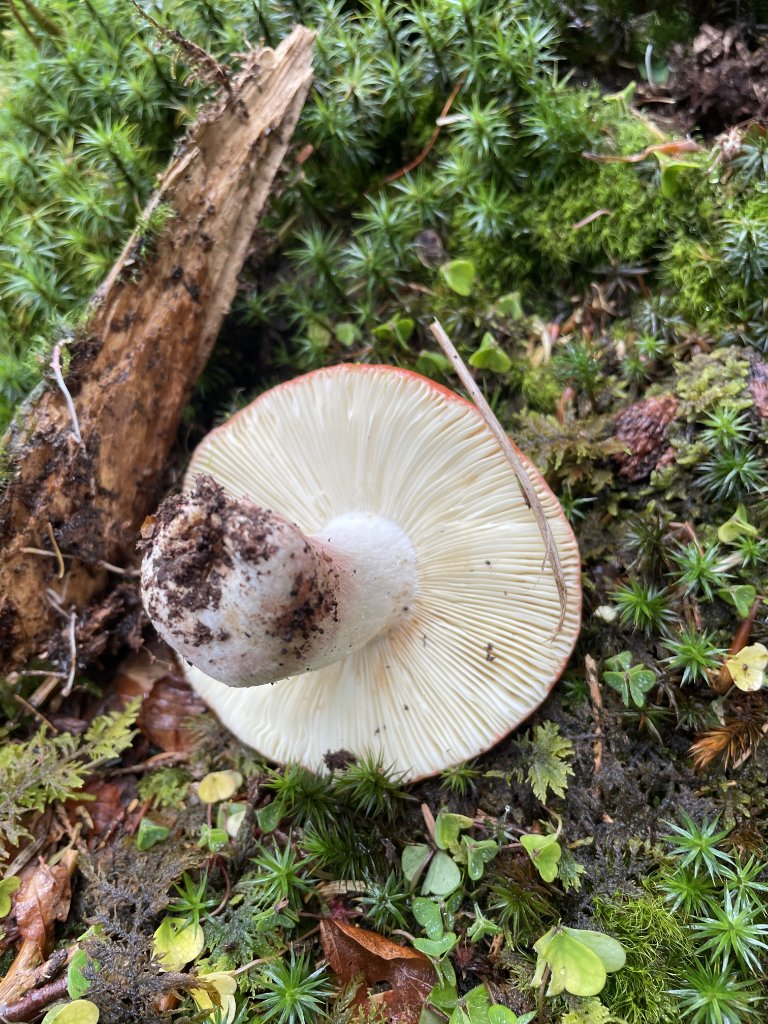 Und das irritiert mich. Gerade bzgl. Unterscheidung zum Großen Rosa-Täubling (R. velutipes), dessen Geschmack auch nach längerem Kauen mild bleibt, der einen weißen Stiel, aber kein festes Fleisch haben soll.