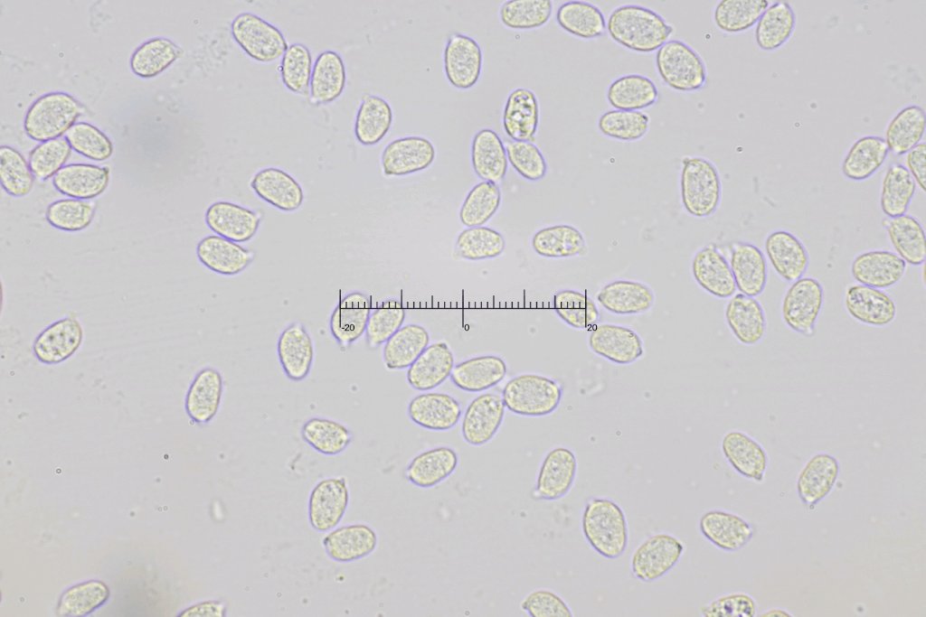 Sporen messe ich 7.7-8.3 x 4.8-5.3 um mit einem Q-Wert von 1.5-1.7. Diese passen sehr gut zu H. chlorophana und sind für H. acutoconica (10-12.5 x 4.5-6.5) doch signifikant zu klein. Zudem passt auch die Sporenform (vgl. Funga Nordica, S. 197) im Vergleich zu anderen Arten sehr gut zu H. chlorophana.