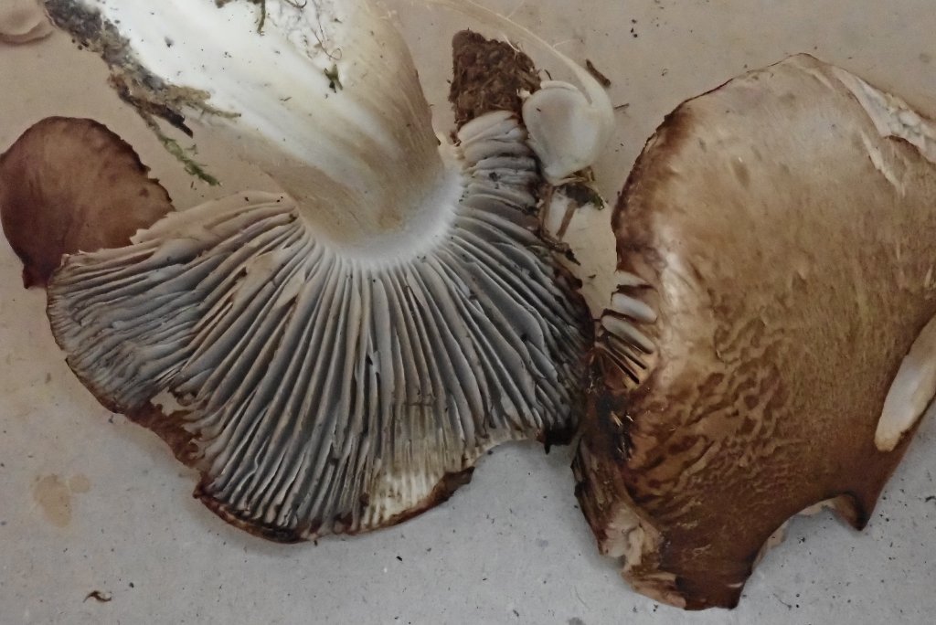 Gleich der nächste Ritterling aus Furx, der mich einige "Zeit und Nerven" gekostet hat. Es war ein Seifen-Ritterling und doch keiner ... Richtig dunkelgraue Lamellen und die Schneiden beim Eintrocknen sogar fast schwarz. Andere Gattungen außer Tricholoma hatte ich auch geprüft und wieder verworfen. Etwas ratlos hatte ich alle verfügbare Literatur durchgeackert. Es gibt einen Graublättrigen Bronze-Ritterling. Da passte außer den grauen Lamellen gar nichts. Sonst gibt es außer den Erd-Ritterlingen keine mit richtig grauen Lamellen. Außer eben diesen passt alles zum Rosa Seifen-Ritterling (Tricholoma boudieri). Der bekommt jetzt einmal noch ein cf., ich werde dann noch Irmgard kontaktieren.