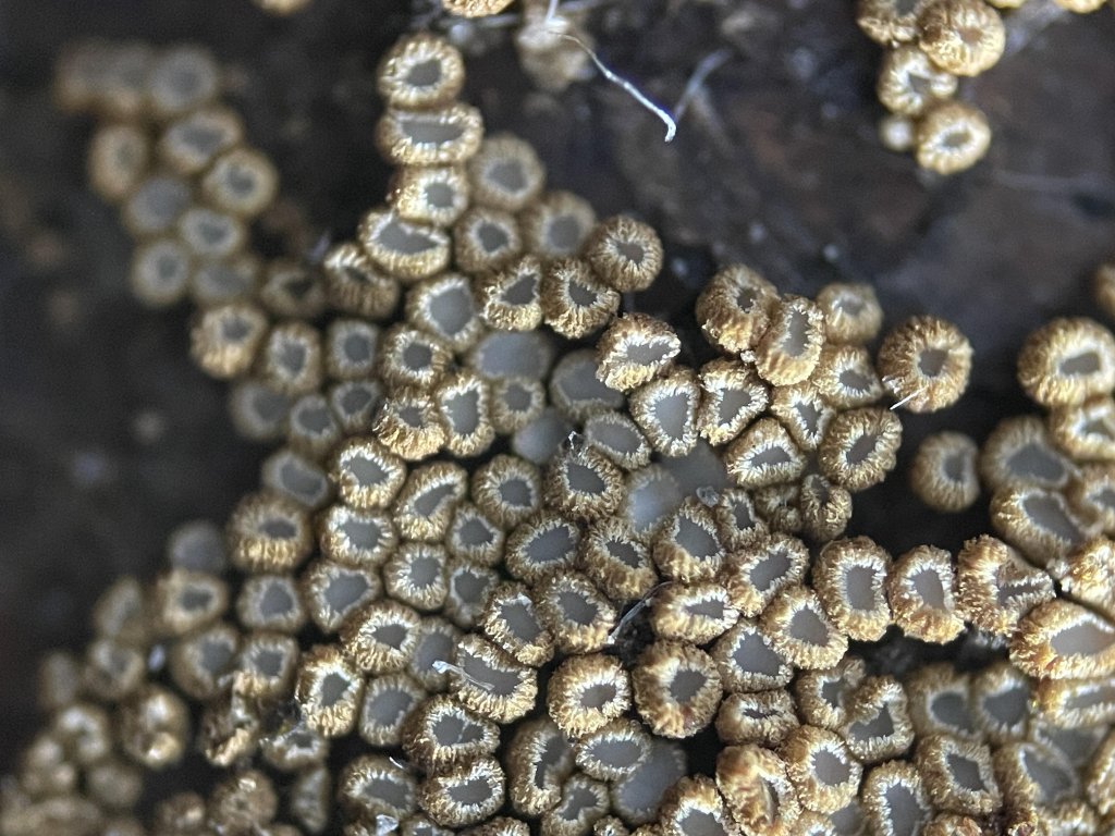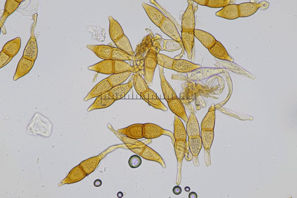 Auf Fichtenzapfen. Ein alter Bekannter ist diese Art. Zwar macht der Zapfen-Fleckenpilz makroskopisch nicht viel her, aber die Sporen sind immer wieder schön anzusehen.