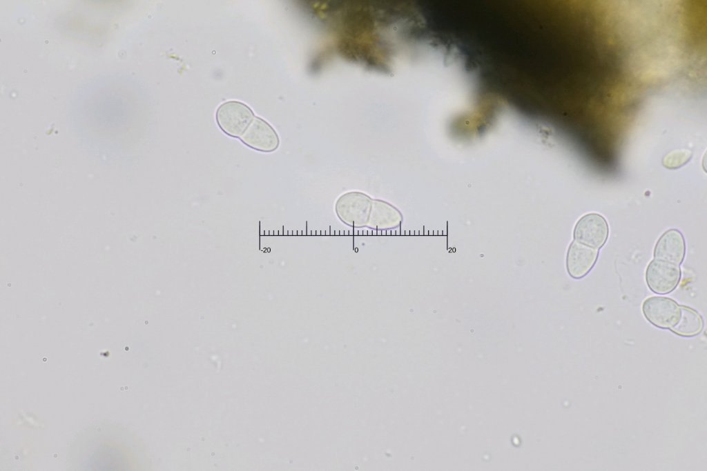Die Hysterothecien sind zumindest breiter als hoch, länglich und lippenförmig. Die Sporen sind hyalin und durch ein Septum in zwei Zellen unterteilt. Die Größe ist im Schlüssel mit 15–18 x 5–6 um angegeben. Meine sind mit 14.2-16.6 x 7.1-8.1 um etwas breiter, ich habe aber an der breitesten Stelle und nicht in der Mitte gemessen.
