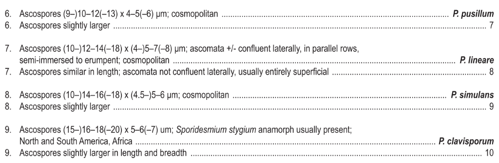 Für P. pusillium mit Sporen von (9–)10–12(–13) x 4–5(–6) um sind meine Sporen mit 14.2-16.6 x 7.1-8.1 um - und ich habe hier tatsächlich mehr als 30 gemessen - zu groß. Bei P. lineare mit Sporen von (10–)12–14(–18) x (4–)5–7(–8) um sind meine Sporen auch eher zu groß. Außerdem passt das Merkmal der in parallelen Reihen angeordneten, halb eingesenkten bis hervorbrechenden Ascomata nicht so gut zu meinem Fund. Die Sporenform passt hier allerdings sehr gut. (Abb. 8, M). Bei P. simulans mit Sporen von (10–)14–16(–18) x (4.5–)5–6 um passt sowohl die Sporengröße und die Sporenform (Abb. 8, C) recht gut. Meine Sporen sind doch noch etwas breiter und die obere Zelle etwas runder. Bei P. clavisporum mit Sporen von (15–)16–18(–20) x 5–6(–7) um sind meine Sporen dann schon zu klein und die keulenförmige Sporenform passt gar nicht zu den meinen.