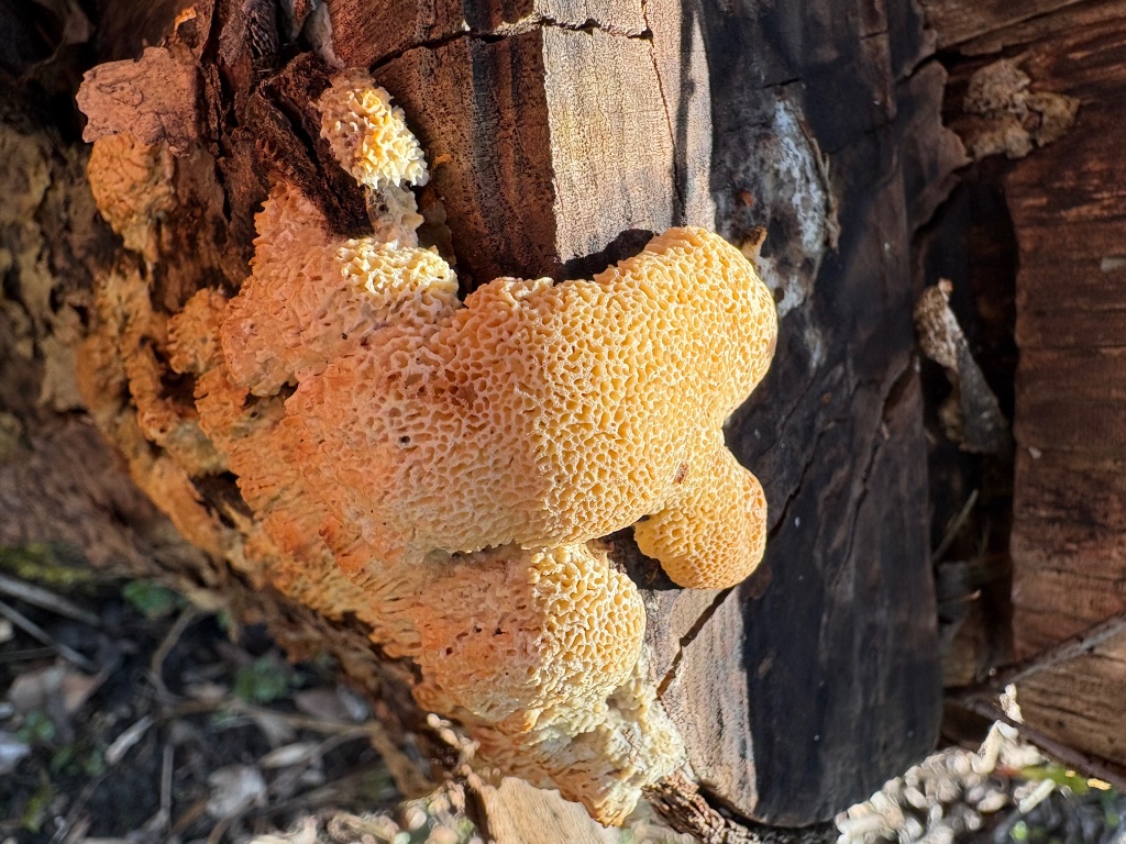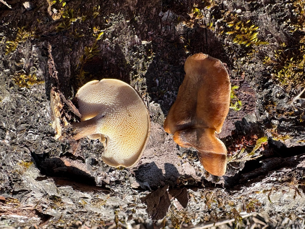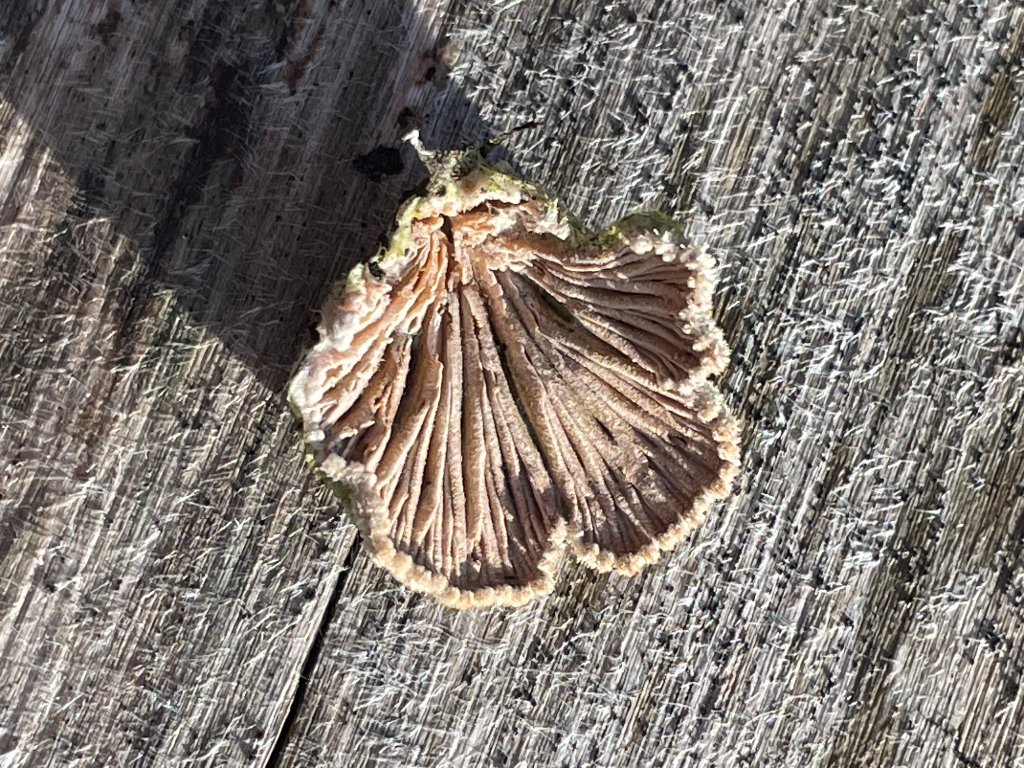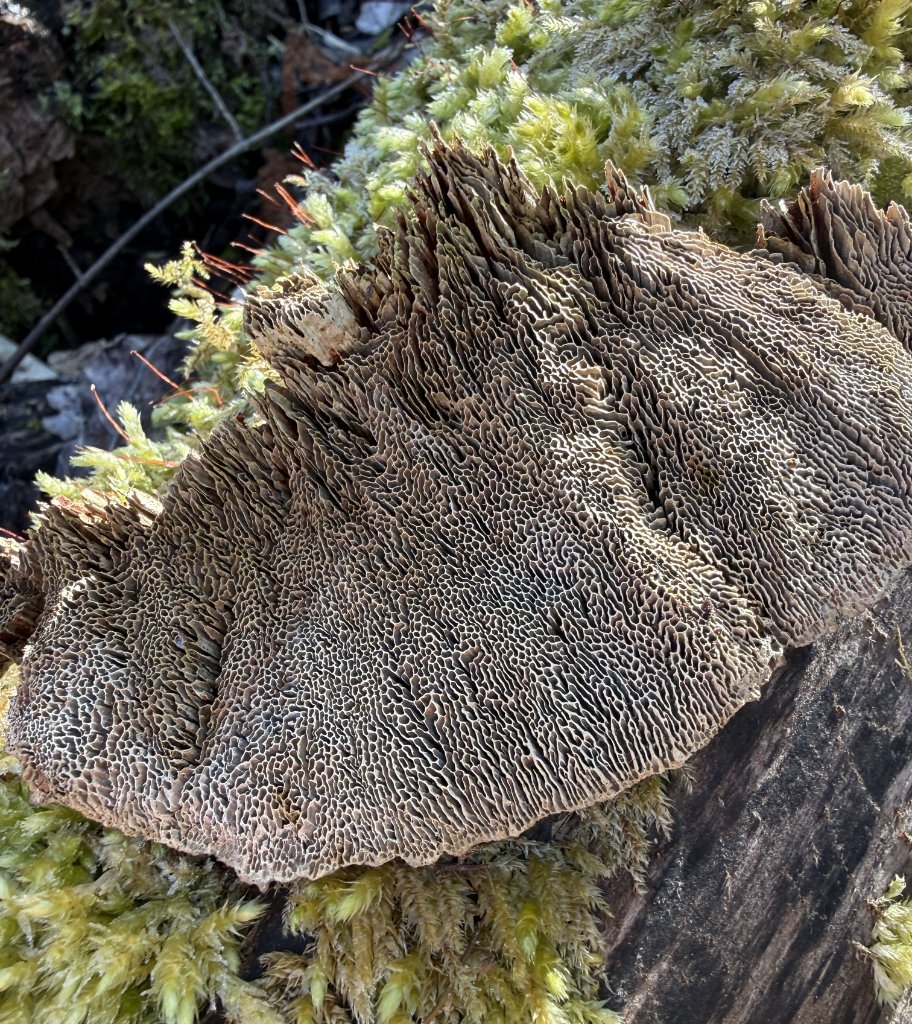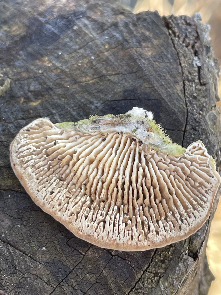 Winter-Stielporling (Lentinus brumalis): gut sichtbare rundliche-rautenförmige Poren - Fruchtkörper rechts