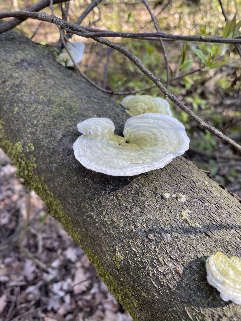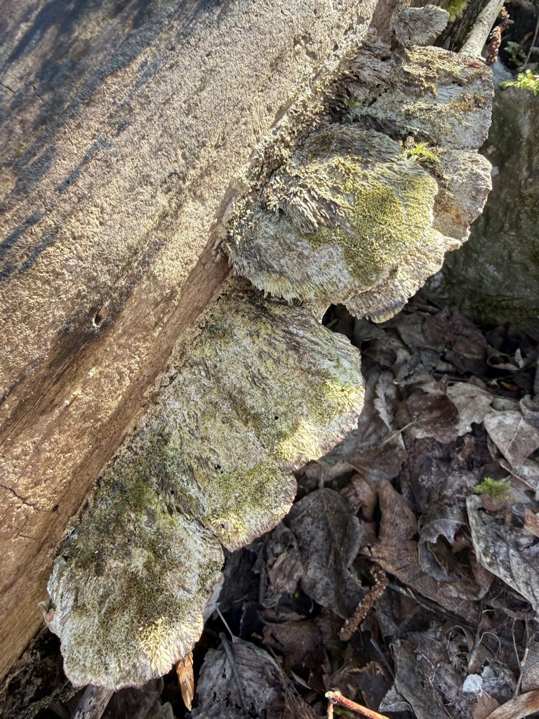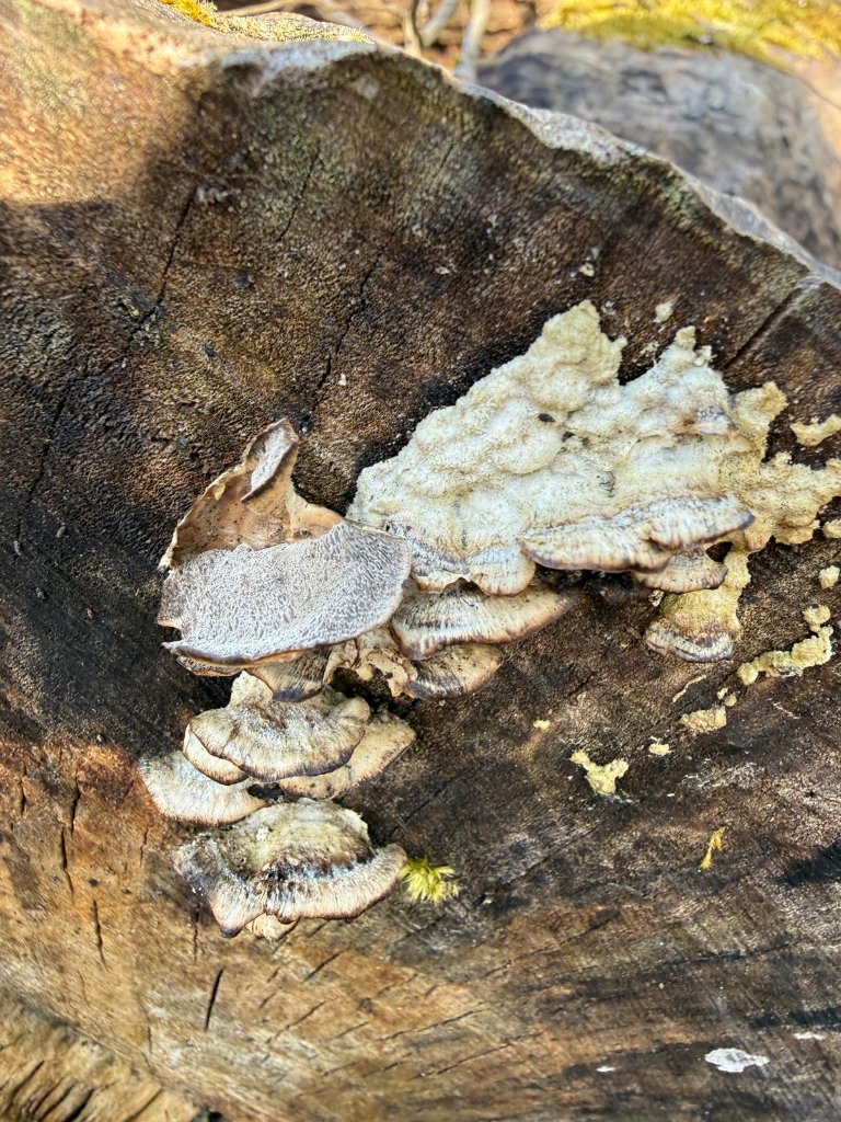 auf totem Laubholz überwachsen mit Moos, ca. 15 Fruchkörper Mai-Stielporling: Poren sind fast nicht sichbar, sehr eng angeordnet - Fruchtkörper links.