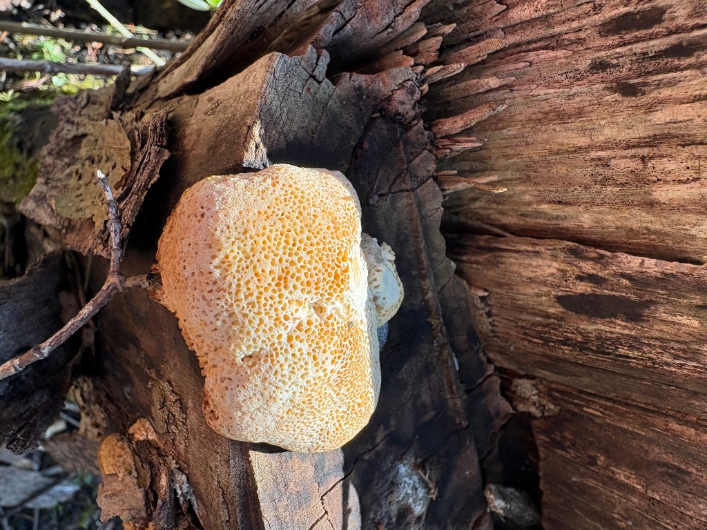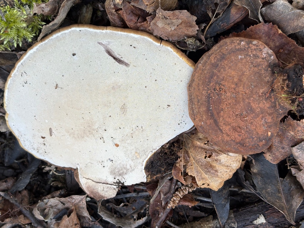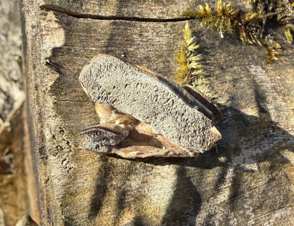 Auf totem Laubholzstamm. Von oben dem Birken-Blättling sehr ähnlich, aber mit runden Poren auf der Unterseite.