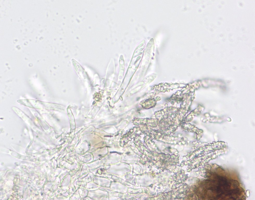Die Asci haben einen amyloiden Keimporus. Die "Pinienförmigen"-Sporen sind mit 5-6 x 1,5 ym eher kleiner als die in Fungi of Temperate Europe beschrieben.