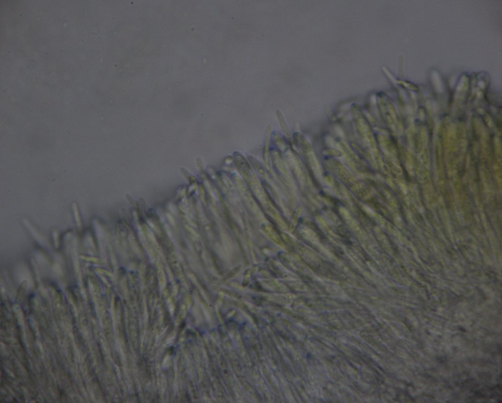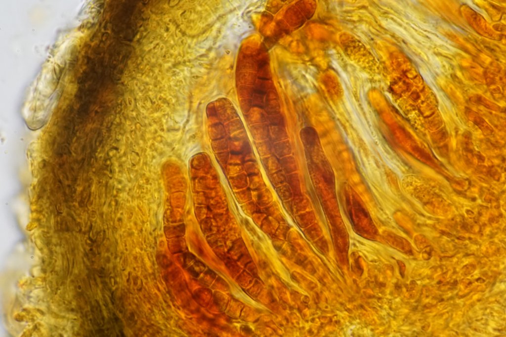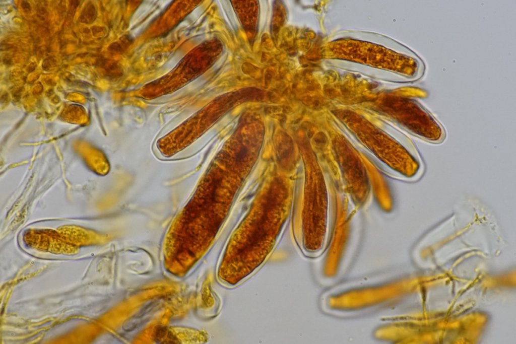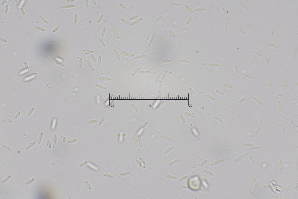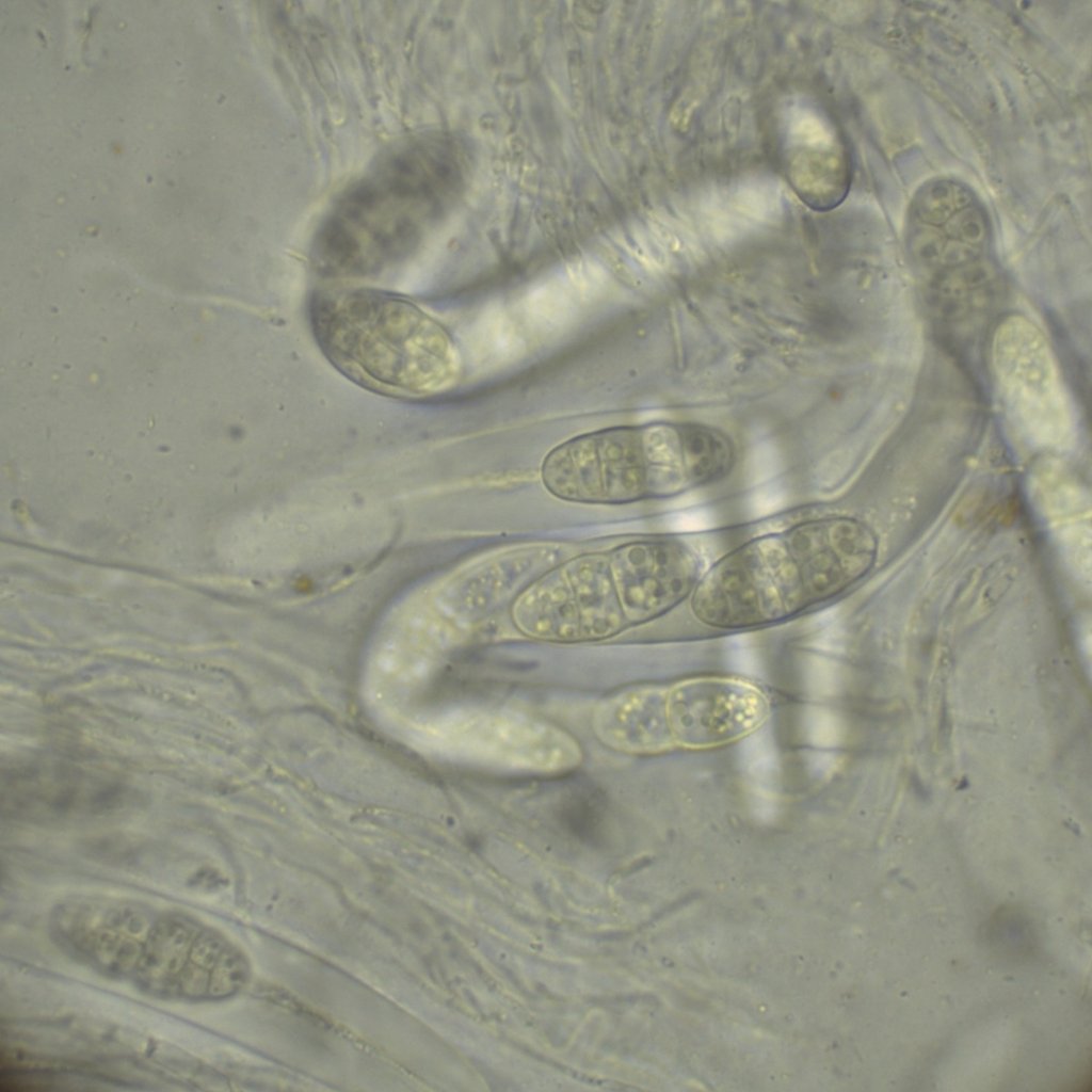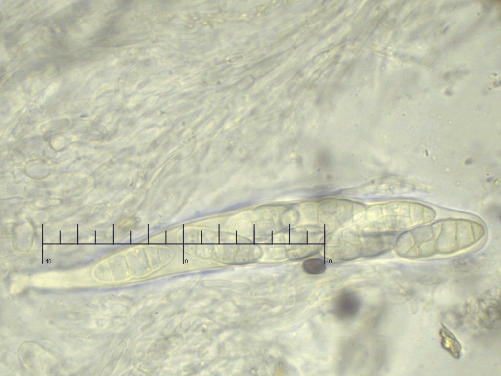 Auffallend sind jedoch die Sporen mit 38.6-45.8 x 15.1-17.4 um (Q = 2.5-2.8) außergewöhnlich groß sind. Bei den meisten kann ich keine Septe erkennen, manche sind einfach septiert. Bei einem kann ich zwei Septen erkennen. Am einen Ende schmaler und flach abgeschnitten - vielleicht ein Keimporus?