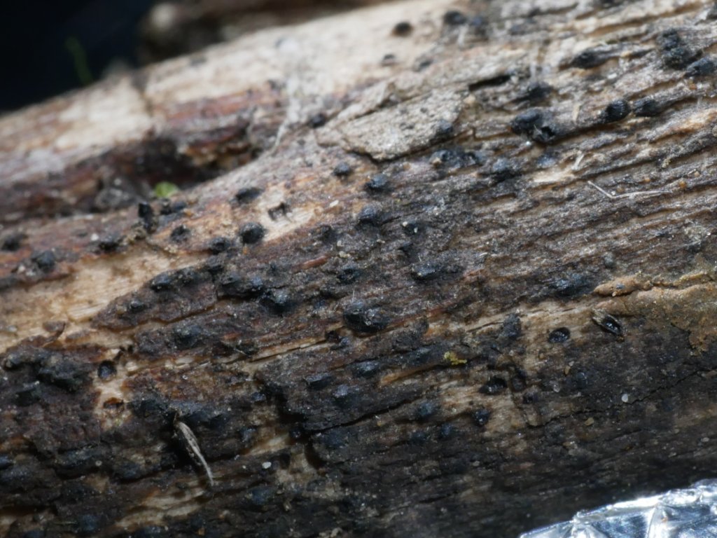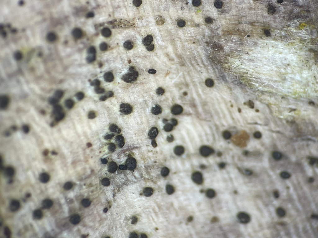 Auf Kiefernzapfen im Auwald; aufgefallen sind mir eigentlich die weißen Punkte, bei denen es sich um die Anamorphe handeln könnte? Die Hauptfruchtform ist ein Pyrenomycet, aber auf den Bildern gar nicht gut erkennbar.