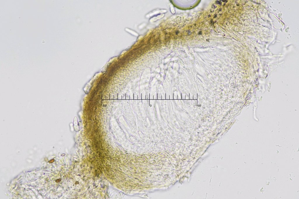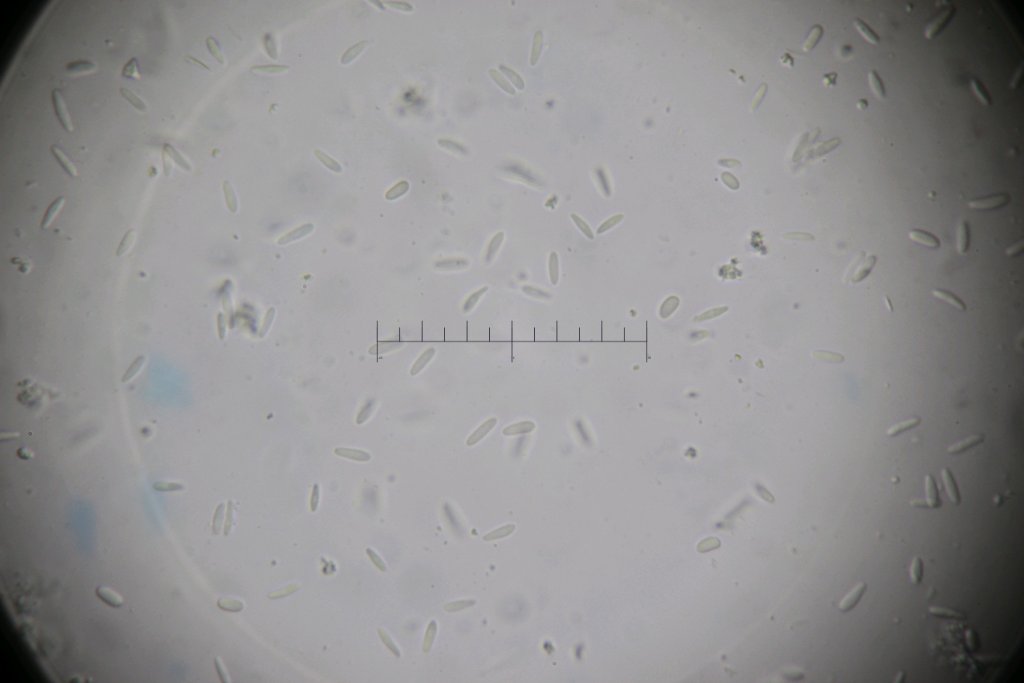 Dasyscyphella nivea - Schneeweißes Haarbecherchen/Wollbecherpilzchen Der Apikalapparat hat sich mit Lugol blau verärbt Sporen unter 1000x: [7.3-9.1] x [2.1-2.7] Q = [3.1-4.0] N = 20