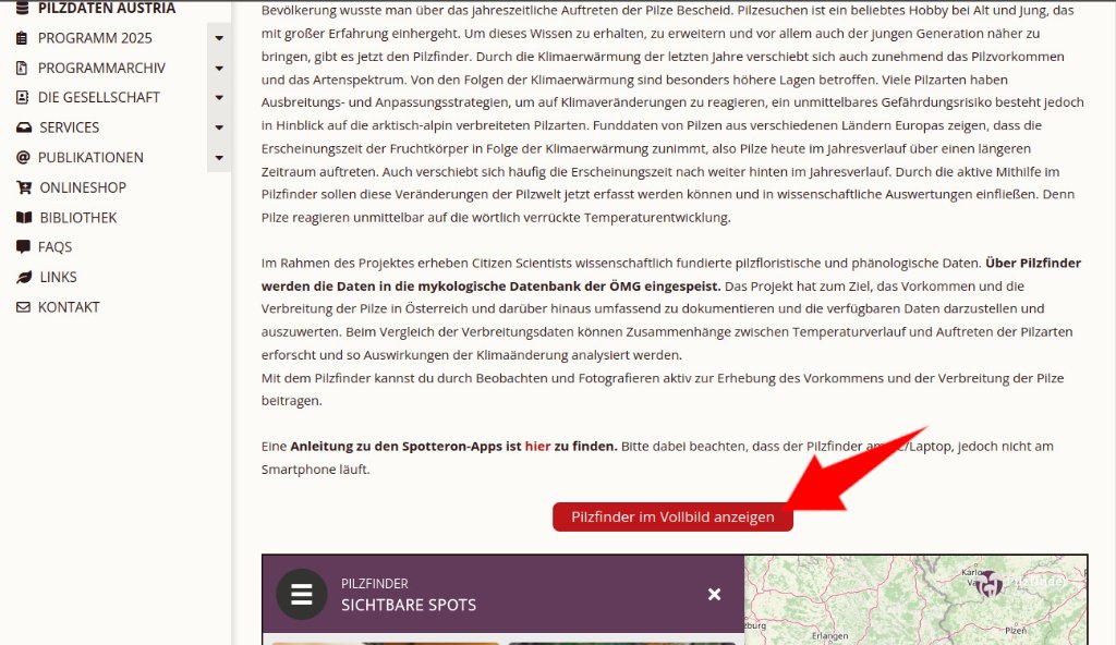 Zur App gelangt ihr z.B. über die Homepage der Österreichischen Mykologischen Gesellschaft (https://myk.univie.ac.at/) indem ihr dort links im Menü "Pilzfinder" auswählt: