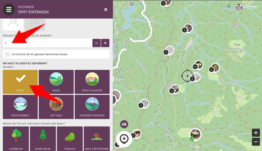 Als nächstes folgt die Angabe der Anzahl der gefundenen Fruchtkörper und weitere Angaben zum Fundort.