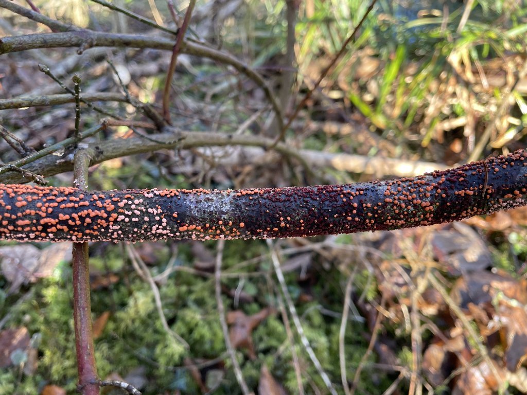 Auf totem Laubholzast im Auwald. Die orange Nebenfruchtform mit den Konidien ist recht häufig und auch gut erkennbar. Meiner Erfahrung nach weniger häufig sind die roten Kügelchen der Hauptfruchtform, welche die Ascosporen beinhalten.