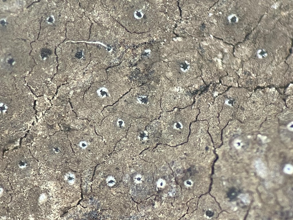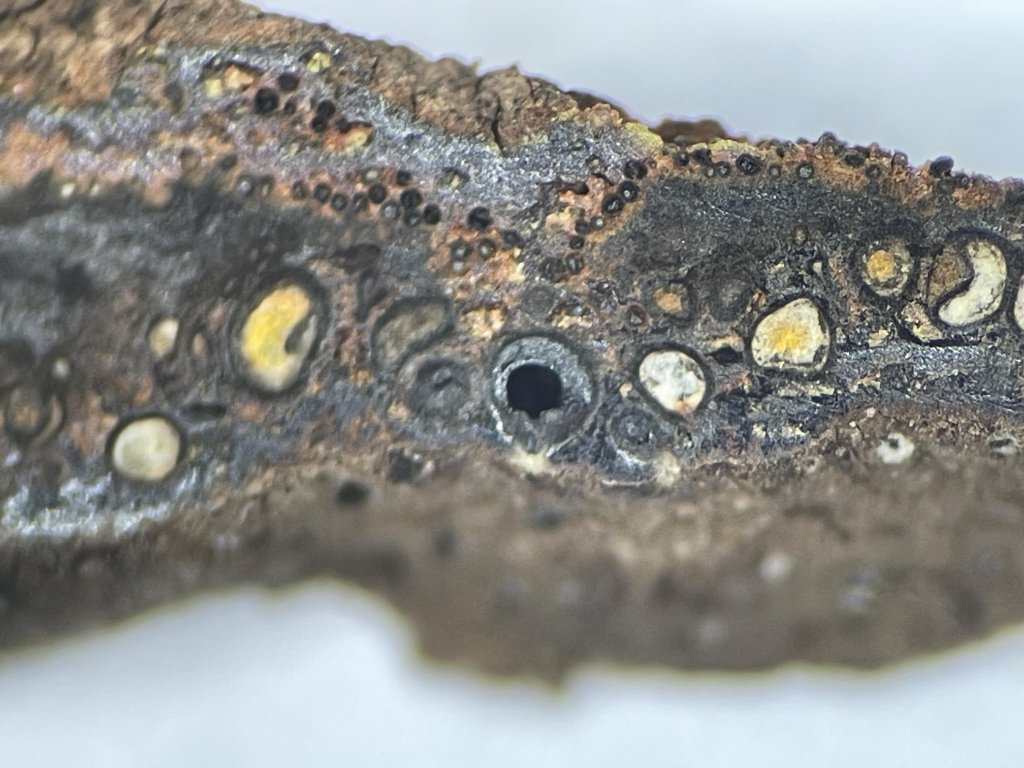 Auf Totholz; Ostiolen mit weißlichem Ring; KOH-extrahierte Pigmente orangefarben und orange Körnchen unter der Oberfläche;