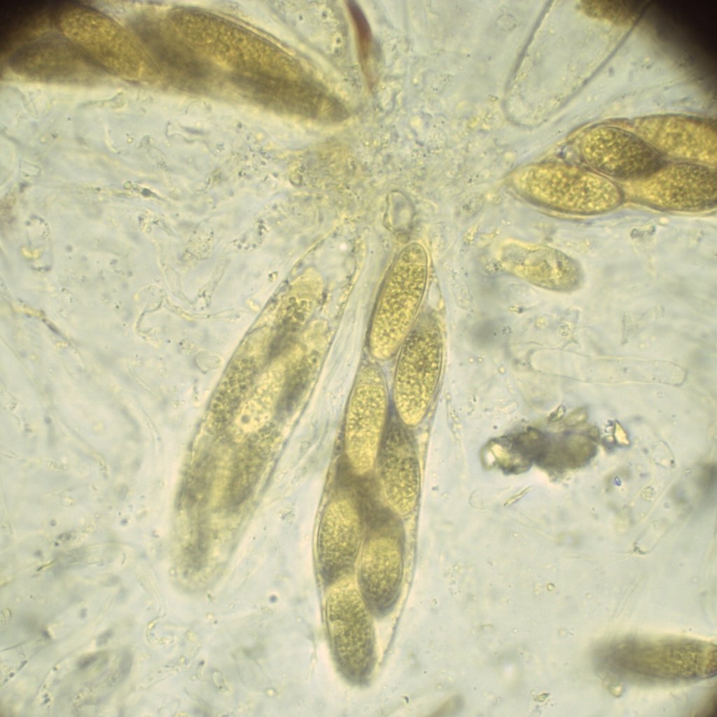 Die Sporen sind jung im Ascus mit großen Tropfen und hell, reif sehr dunkel.