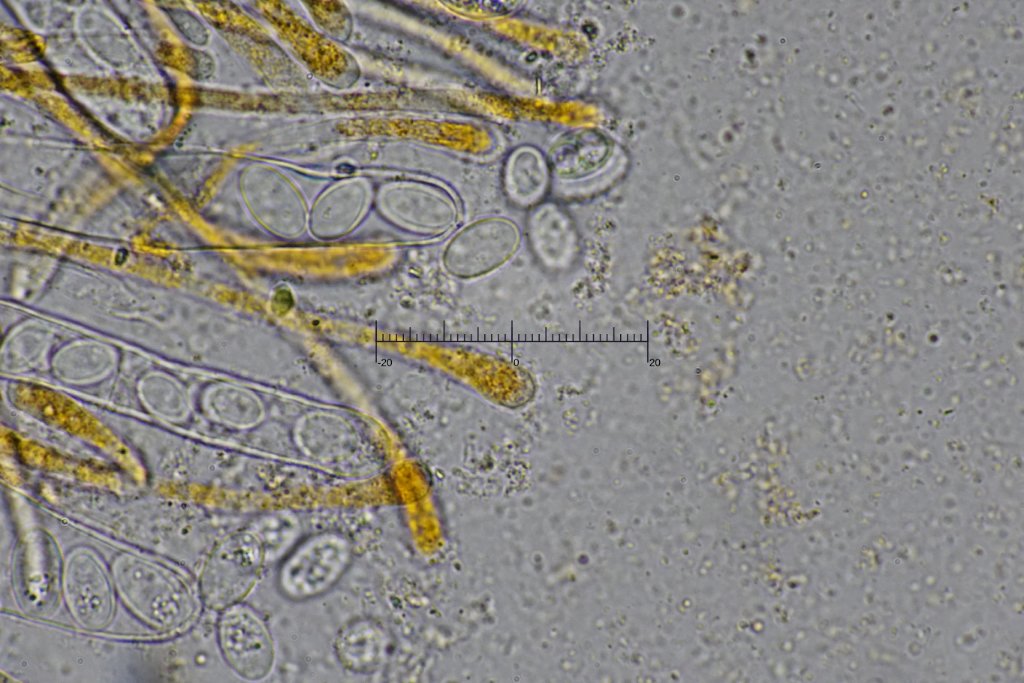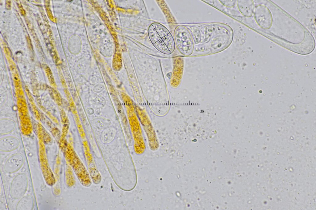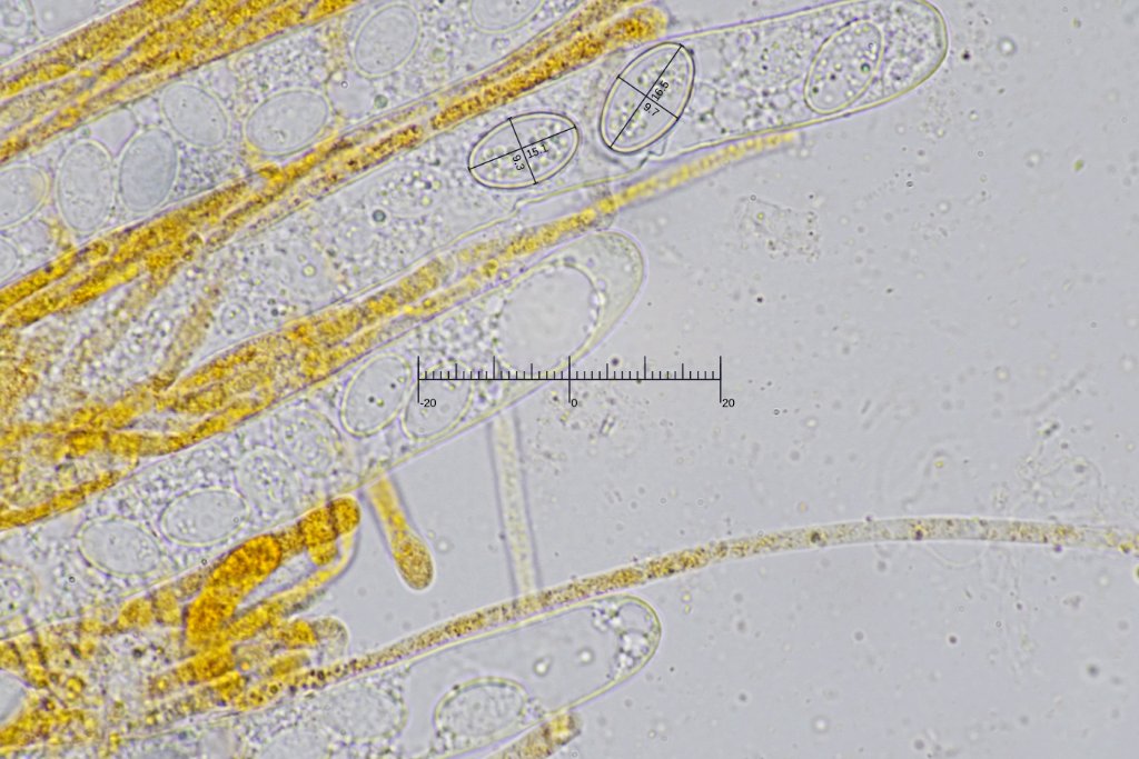Ich habe gerade noch ein paar Sporen gemessen und dabei die größten gesucht. Diese waren aber nicht frei, sondern noch in den Asci. Dabei komme ich auf [15.4-16.8] x [9.4-9.8] um, Q = [1.6-1.7], N = 3; Statistisch aussagekräftig ist das zwar nicht, zeigt aber, dass es auch Sporen gibt, die sehr gut in den Bereich von B. deformis mit (13) 14–17 (18) × 8–10 um passen. Ich denke, die ist es auch.