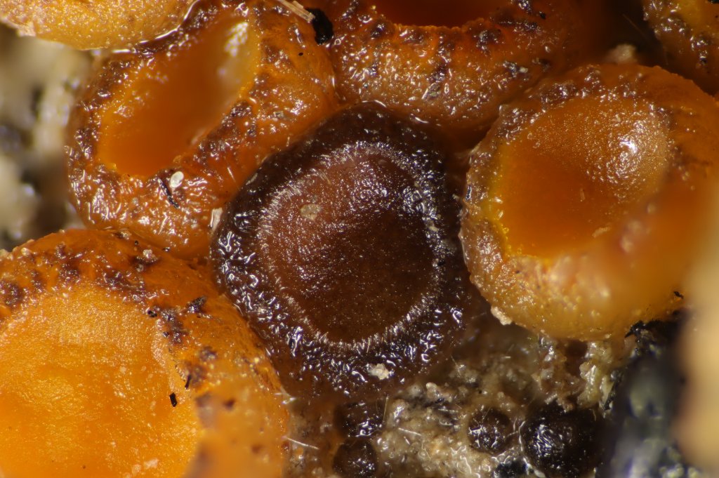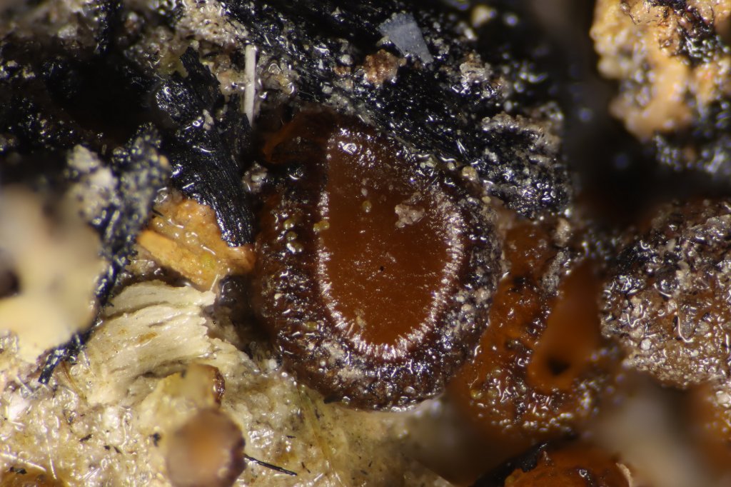 Octospora humosa, mit stumpfen, hellen, nicht wurzelnden Randhaaren. Moosparasiten!