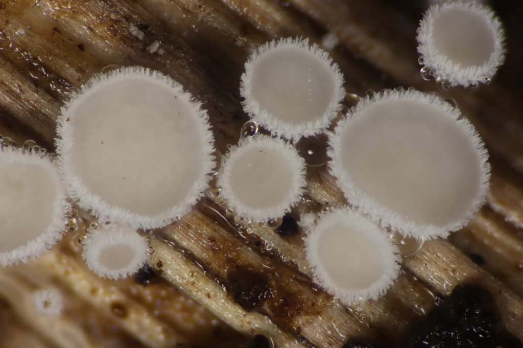 Scutellinia, mit braunen bis schwarzen, abstehenden, wurzelnden und spitzen Randborsten