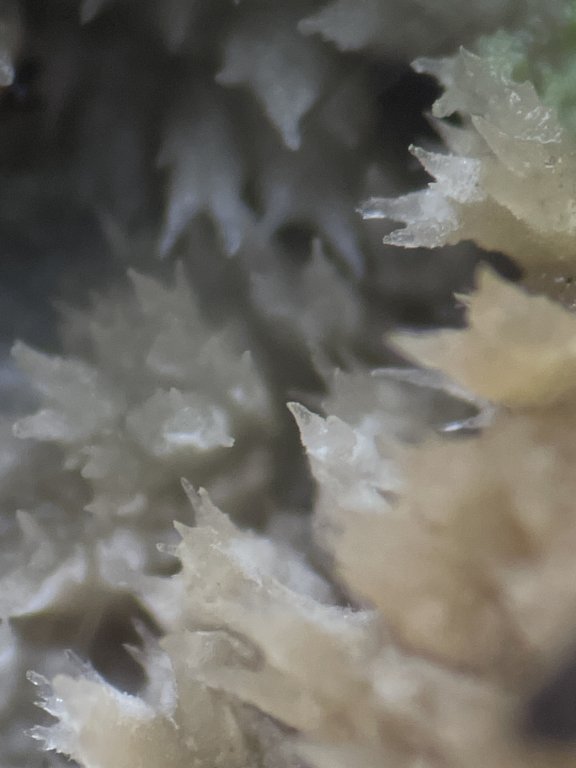 Der Pilz scheint sich aus einzelnen Stacheln und Zähnen zusammen zu setzen. Die Struktur kann man unter der Lupe recht gut erkennen.