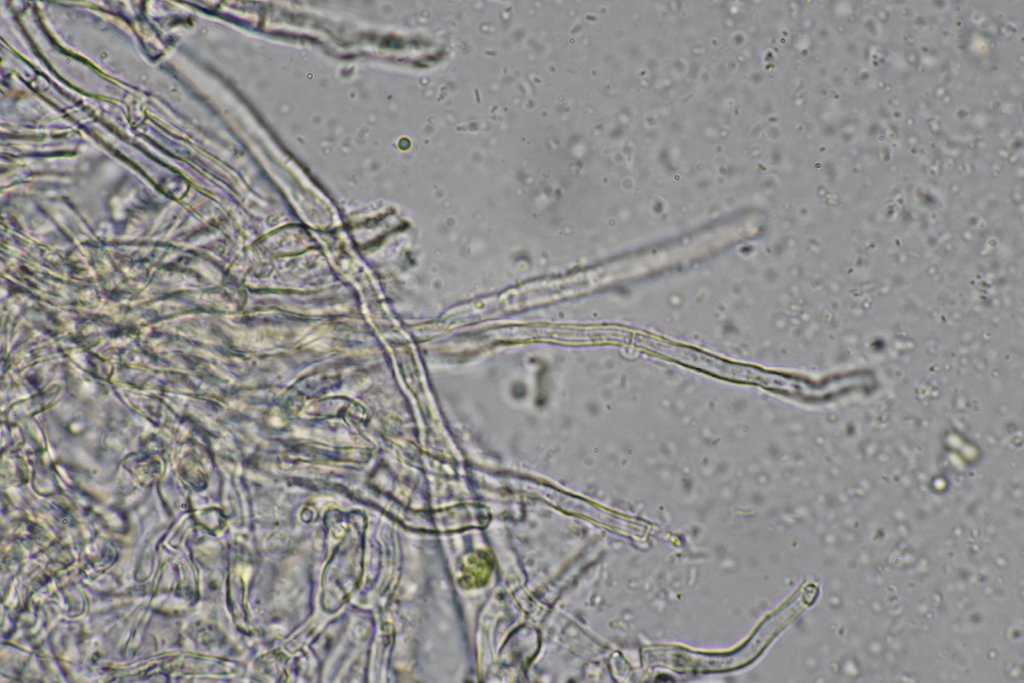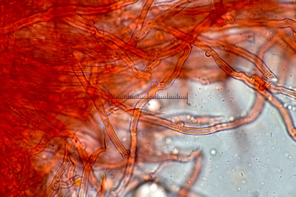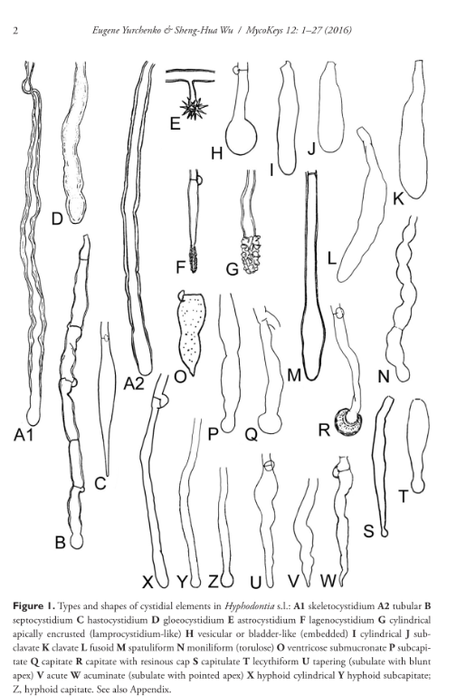 Ich denke, ich bin jetzt einen Schritt weiter. Zur Bestimmung habe ich den Schlüssel von Yurchenko et al. (2016): A key to the species of Hyphodontia sensu lato verwendet. Darin gibt es auch eine schöne Übersicht über die verschiedenen Zystidenformen: