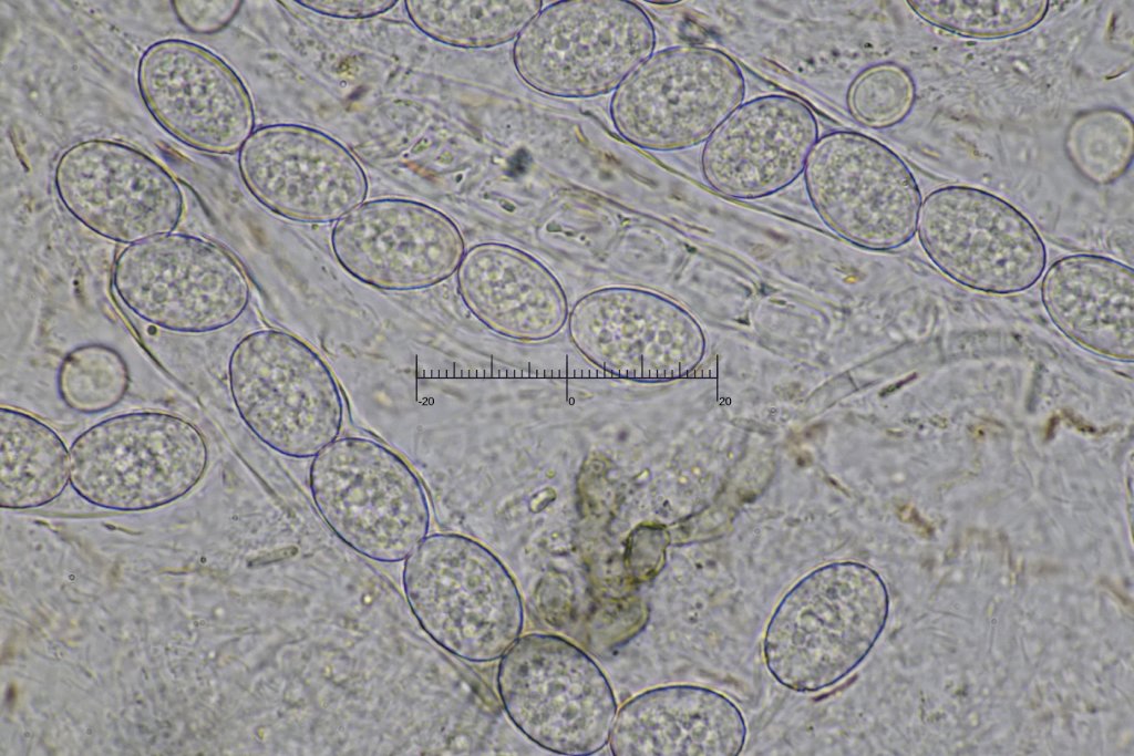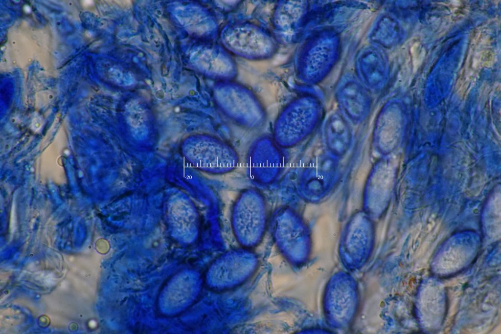 Sporen messe ich 18.4-19.8 x 12.8-14.0 um Q = 1.4-1.5 N = 21. Diese sind doch etwas breiter. Das mag daran liegen, dass mein Exemplar nun doch schon etwas älter ist. Zudem gabe es kaum freie Sporen und ich habe in den Schläuchen vorwiegend große Sporen gemessen.