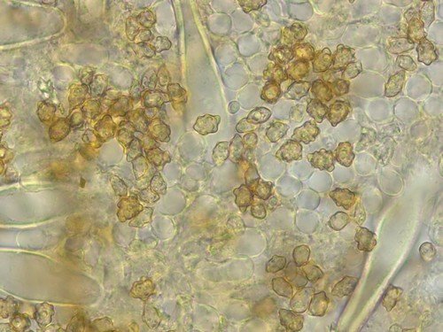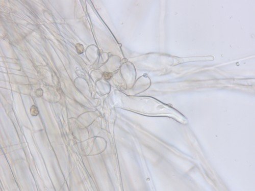 Hutdeckschicht: aus breiten, bräunlich inkrustierten, parallelliegenden Hyphen und hyalinen dünneren Hyphen mit Schnallen